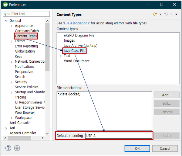 - [General] → [Editor] → [Text Editors] → [Spelling] → 에 Encoding: Default (UTF-8) 이면 그대로 사용하시면 되고 다른 타입이면 Other: 를 선택하여 UTF-8로 선택하면 되요~!
