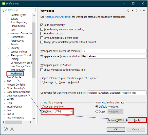 - [General] → [Workspace] → 하단에 Text file encoding을 Other: 로 체크하고 UTF-8로 변경해줍니다.