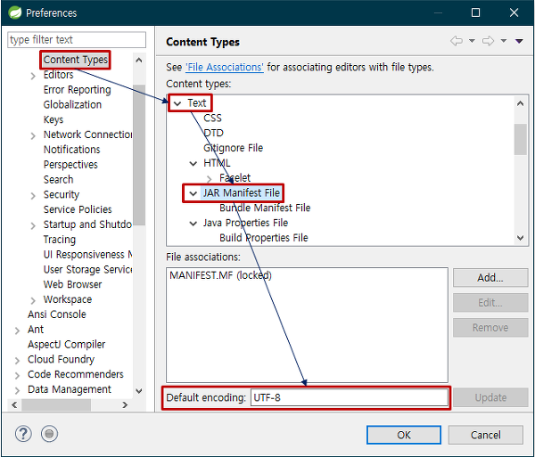 - 하단에 Default encoding에 UTF-8을 입력하고 UPDATE를 클릭합니다.