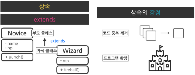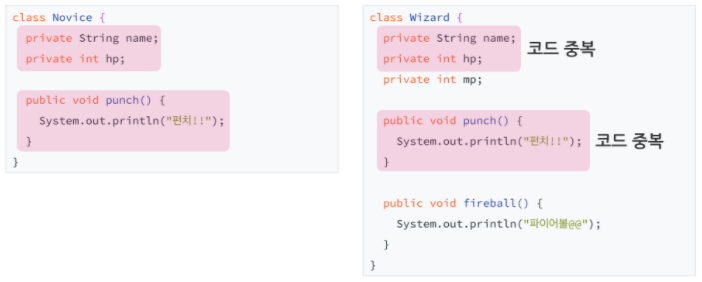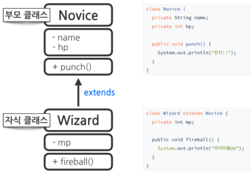 extends 키워드를 사용하여, 마법사(Wizard)가 초보자(Novice)를 상속받게 했다. 이를 통해 코드를 줄일 수 있다.