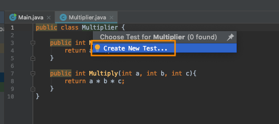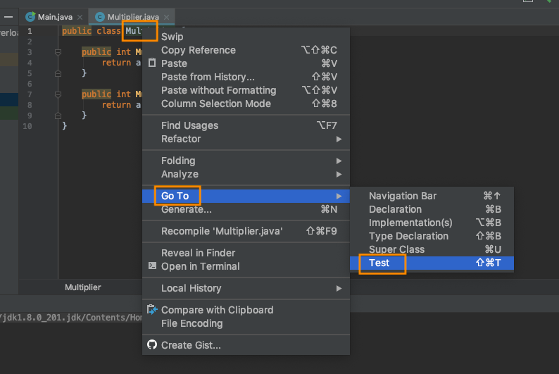 테스트를 하고자 하는 Multiplier 클래스의 클래스명 위에서 우클릭하여 Go to - Test를 클릭한다.