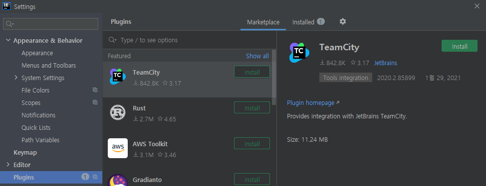 ※ 플러그인(이클립스식 Marketplace)는 setting창의 plugins에 있다.