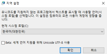 - 시스템 로컬 변경 > 지역 설정에 체크박스 해제 후, 확인 및 시스템 재시작