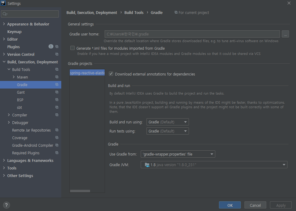 2. Build, Execution, Deployment > Build Tools > Gradle에서 Gradle projects > Gradle JVM 1.8 선택