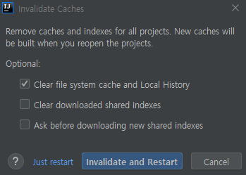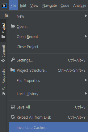 1. IntelliJ 상단 메뉴에서 'File > invalidate Caches' 선택