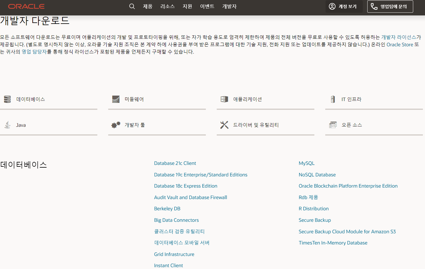 1) 개발자 다운로드 > 데이터베이스 > Database 21c Client 선택