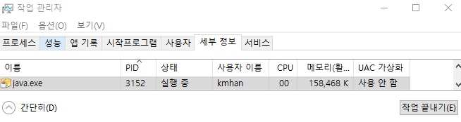 - 작업 관리자 > 세부 정보 : PID가 3224인 작업 끝내기