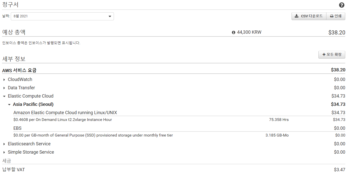아마존 엘라스틱서치 기본값 10GB로 생성하고 한달 2주 지났는데 5만원 요금 청구되었습니다.
