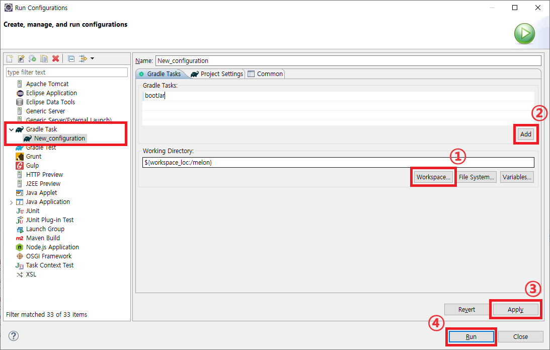 3) 환경(ex. 1.8)에 맞는 jar 설정 후에 Gradle Task > Run