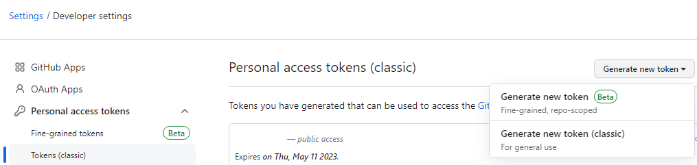 profile > settings > Developer settings > Personal access tokens > Tokens (classic) > Generate new token > Generate new token (classic)