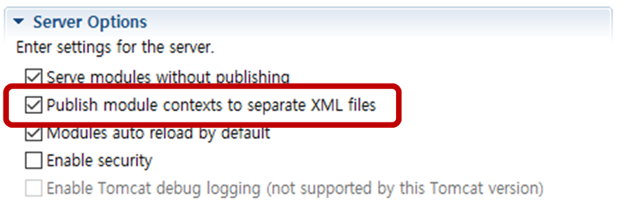 해결방법 : [Server Options]에서 'Publish module contexts to separate XML files' 체크