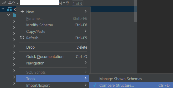 1. 기준 스키마 우클릭 Tools > Compare Structure