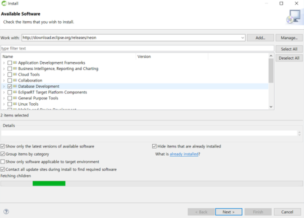 3. Database Development만 체크해주고 next를 눌러준다. next - next - finish - 설치가 완료되면 스프링이 재시작된다.