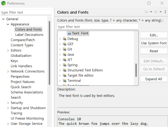 2. Preferences > General > Appearance > Colors and Fonts 클릭