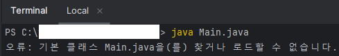 3. 에러메시지 : '오류: 기본 클래스 Main.java을(를) 찾거나 로드할 수 없습니다.'