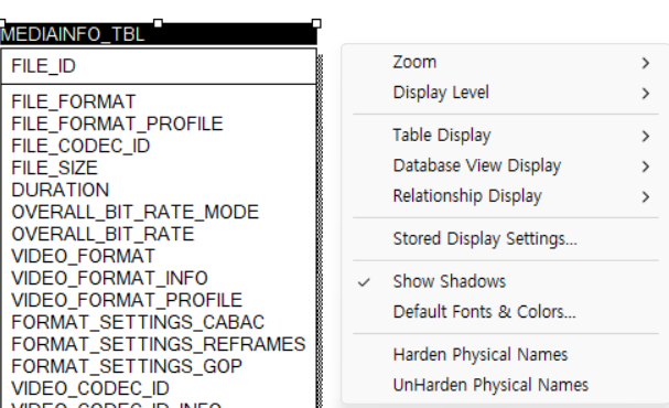 - 적용할 테이블 선택 후에 배경화면 우클릭 Harden Physical Names