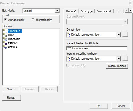 2. Model > Domain Dictionary 선택하고 Edit Mode를 Logical로 선택