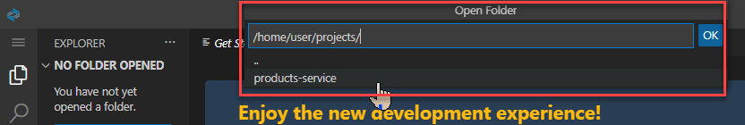 - /home/user/projects/ 입력후에 products-service 선택