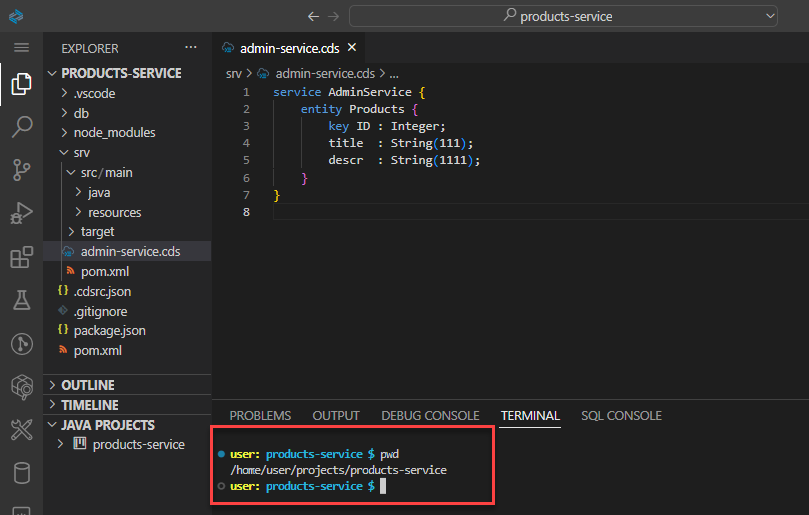 1) 터미널에서 pwd 명령어를 실행하여 products-service 경로인지 확인합니다.