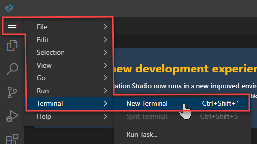1) 메뉴에서 Terminal → New Terminal 를 클릭합니다.