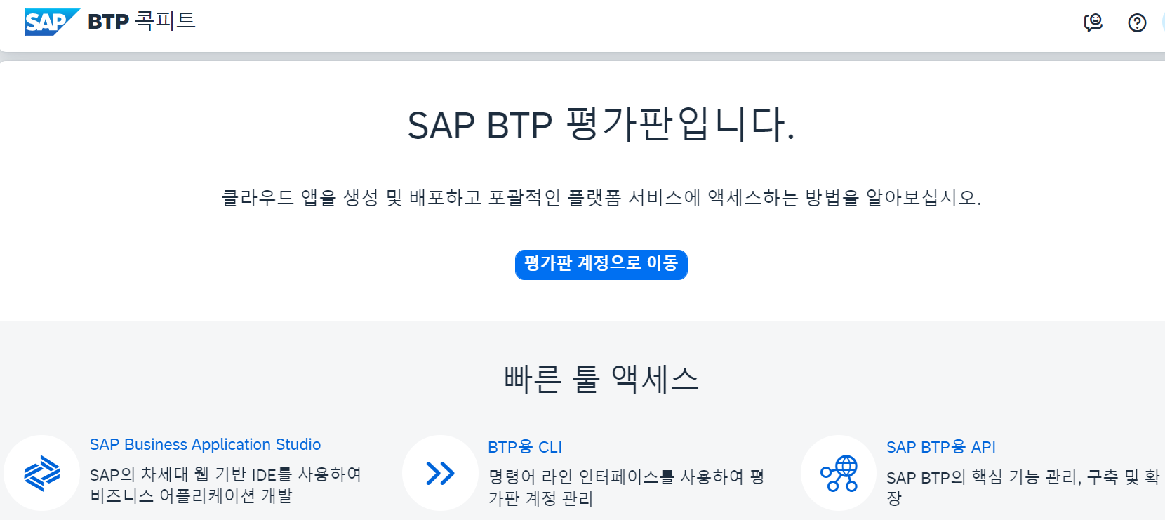 1) SAP BTP Cockpit Trial 화면 접속한 후에 SAP Business Application Studio를 클릭합니다.