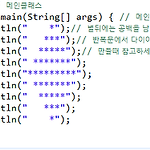 ※ 해당 글은 제가 14년도에 학원 다닐때 직접 작성했던 자료입니다. 이중 for문을 쓰면 구구단, 선택정렬, 성적프로그램의 등수매기기 등 활용할 수 있는 범위가 상당히 넓습니다. 그래서 오늘은 이중 for문으로 별찍는 방법을 알려드리겠습니다. 그전에 해야 할 것이 있습니다. 1-1. 별개수만큼 출력해보기(0도 출력)1) 별 출력 2) 0(+별)을 출력- 별을 찍었는데 굳이 0을 또 찍는 이유는 공백으로 수정하기 전에 눈에 보이게 하여 이중 for문에 대한 이해도를 향상 시킬 수 있기 때문입니다. 1-2. 라인개수만큼 출력 1-3. 0을 공백으로 수정 --------------------------------------------------------------------------------------..