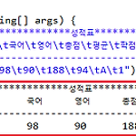 ※ 해당 글은 제가 14년도에 학원 다닐때 직접 작성했던 자료입니다. 성적처리프로그램을 처음부터 배열(7일차 과제)까지 만들어보겠습니다.※ 자바를 처음 접하신 분은 자신이 어디가 부족한지 확인할 수 있는 좋은 기회입니다. ------------------------------------------------------------------------------------------------------ 1. print() : 출력문 - 성적처리프로그램에 자신이 없는 사람들을 위해 먼저 print문으로 출력해봤습니다. 2. 변수 - 첫날에 배운 변수에 넣어서 출력한 결과입니다. 3. 조건문(if) : 학점 매기기 - 평균(점수)에 따라 학점이 정해지므로 조건문을 넣었습니다. 4. 배열 - 여러명의 데이터를..
