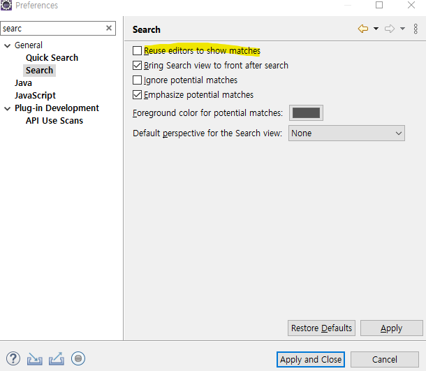 이클립스 Search 시에 기존에 Search로 열린 창 닫히지 않고 새창으로 나오게 하는 방법